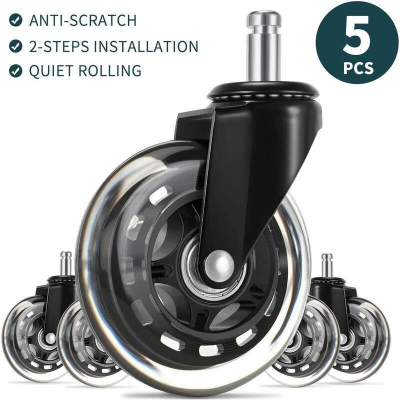 LE UNICHE RUOTE PER SEDIA DA UFFICIO CHE UTILIZZATE MAI PIÙ - Le nostre ruote per sedie per impieghi gravosi sono realizzate in acciaio di qualità industriale, cuscinetti a sfera di precisione e rotelle per sedie in poliuretano durevoli. PROTEGGI TUTTI I PAVIMENTI DAI SCRATCHING - Le rotelle per sedie da ufficio sono sicure per tutti i pavimenti, ideali per moquette, piastrelle, pavimenti per uffici, legno duro, parquet, laminato. E può anche proteggere i tuoi pavimenti da graffi e danni sulla superficie. MONTAGGIO FACILE - Senza alcun attrezzo necessario, puoi semplicemente assemblare le ruote sterzanti in pochi minuti. Basta rimuovere le ruote piroettanti esistenti estraendole e spingendo le nostre nuove ruote nella presa, SCIVOLO LISCIO: scivolerai e scivolerai in totale silenzio con le nostre ruote girevoli in stile rollerblade. ADATTO A TUTTE LE SEDIE - La dimensione della presa è: 50 * 24 mm, queste ruote sono adatte per la maggior parte delle sedie, come sedie da gioco, sedie