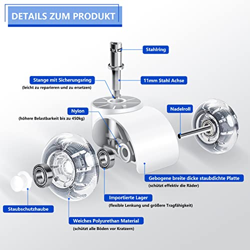 Struttura e materiali affidabili: le ruote sono realizzate in metallo e poliuretano di alta qualità, con due cuscinetti di precisione a doppia sfera trasparenti e un pneumatico in poliuretano ammortizzante, sopportano un carico fino a 317 kg (700 lbs) e possono offrire una sterzata a 360 gradi, offrendo la migliore esperienza di rotazione. Le ruote per pavimenti duri sono rivestite con un rivestimento in poliuretano che protegge il pavimento da danni e impronte.