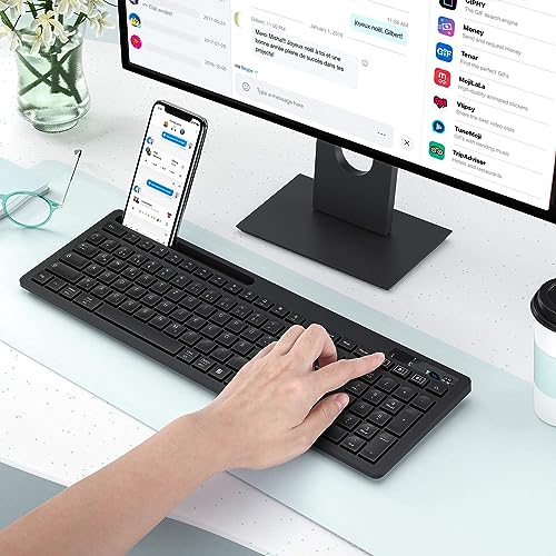 Pratico supporto per cellulare: la tastiera Bluetooth con supporto per cellulare può mantenere il telefono all'angolazione giusta per leggere o digitare, offre un'esperienza di digitazione perfetta. La robusta custodia per tastiera assicura che il telefono rimanga stabile e non cade. La pellicola per tastiera in silicone in dotazione può proteggere efficacemente questa tastiera PC da polvere e liquidi.
