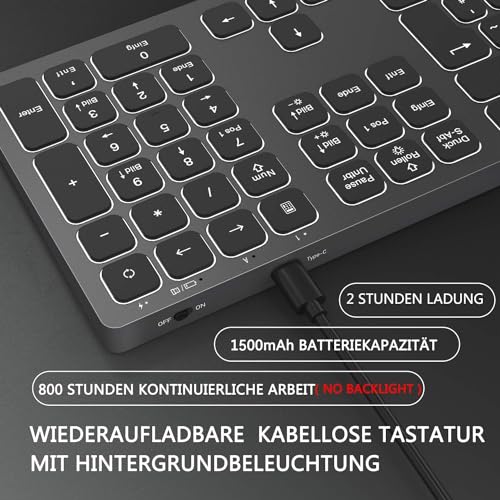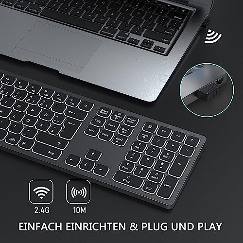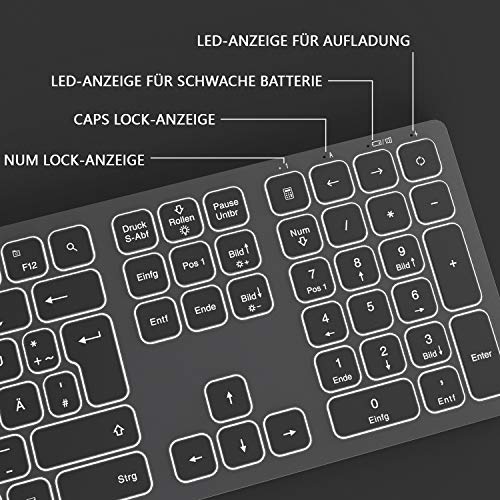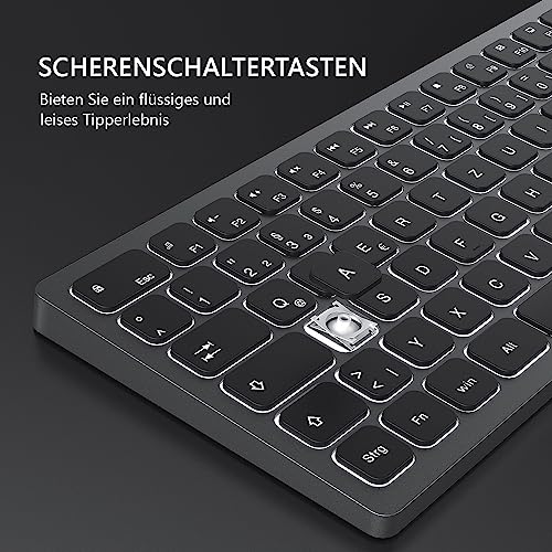 Seenda Tastiera wireless illuminata con retroilluminazione a LED bianca, layout QWERTZ, ultra sottile e ricaricabile, per Windows, PC/laptop/tablet, colore: grigio