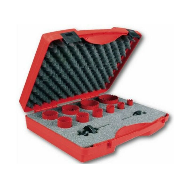 Fornito con 10 seghe a tazza bimetalliche in cassetta di plastica composte da: n° 10 988 G (Ø 19-22-25-29-35-38-44-51-57-64) n° 1 988 GA2: Adattatore per seghe bimetalliche a 35÷64 n° 1 988 GA4: Adattatore per seghe bimetalliche a 19÷29 Per la foratura di tutti i tipi di materiale con spessori piccoli Dentatura variabile in acciaio HSS Intagli laterali Profondità di taglio Max 38 mm