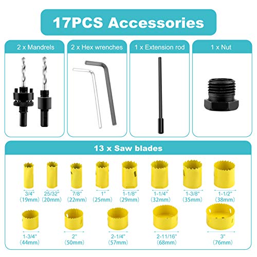 Set di 17 seghe a tazza bimetalliche HSS da 19 mm - 76 mm, set di seghe a tazza bimetalliche con 13 lame per sega, 2 punte per legno, cartongesso, plastica, piastra in PVC e metallo morbido
