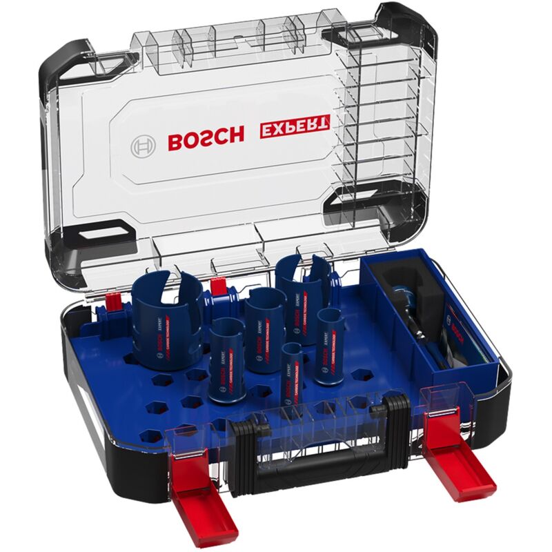 Set di seghe a tazza BOSCH EXPERT Construction Material - Durata fino a 50 volte superiore di una sega a tazza bimetallica nei materiali resistenti - Lunga durata nella realizzazione di fori in diversi materiali - Durata estrema grazie a Bosch Carbide Technology - Denti rettificati individualmente in metallo duro