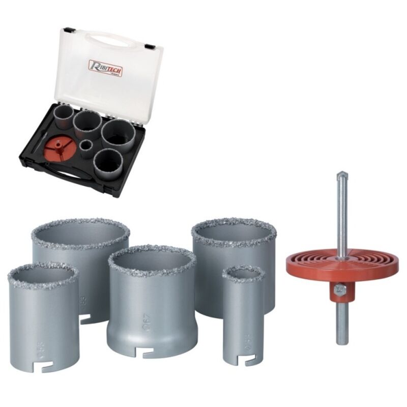 Seghe a tazza diamantate set da 5 pz Ribimex PRSCDX5/M Ideale per la foratura di piastrelle, ceramica, mattoni e cemento. Valigetta con 5 seghe a tazza dalle seguenti dimensioni: 33,53,67,73 e 83 mm, rivestite in acciaio al carbonio A3. Principali caratteristiche: Set da 5 seghe a tazza. Pratica valigetta di trasporto. Punta di centraggio al carburo di tugsteno galvanizzato e platorello in alluminio. Dimensioni delle seghe a tazza: h 65 mm x 33,53,67,73 e 83 mm di diametro. Peso: 1,28 Kg.
