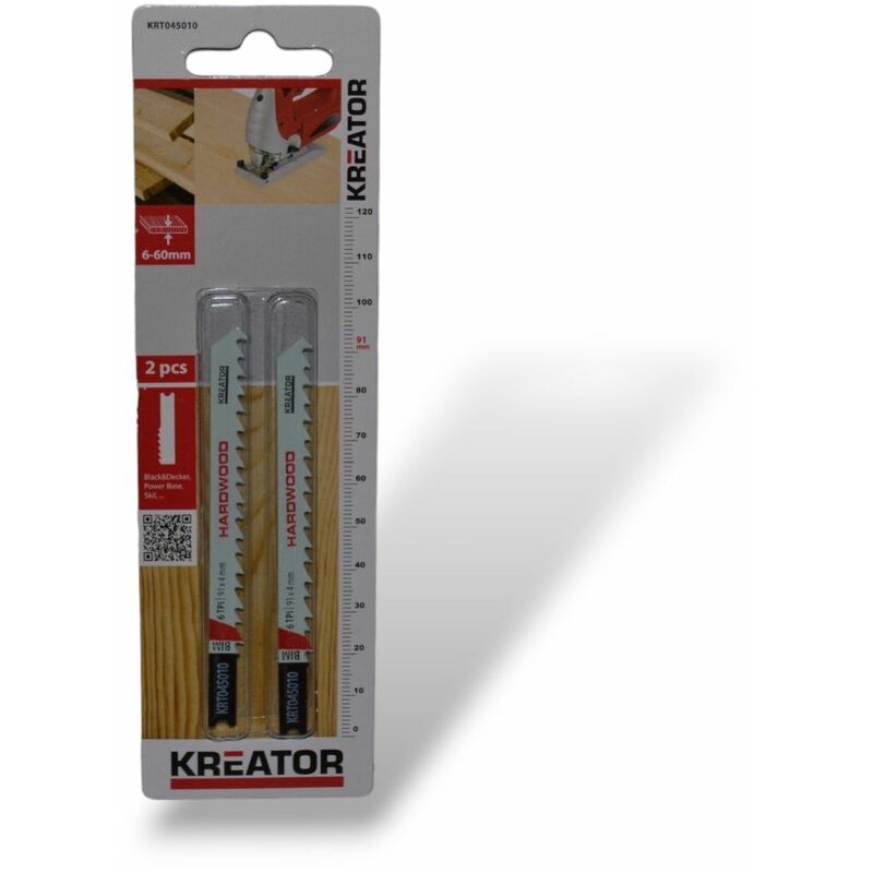 Lame - Marca Kreator - Modello KRT045010 - Per seghetto allternativo - Lunghezza 91 mm - Numero di denti 6 TPI - Confezione 2 pz Lame Kreator KRT045010 confezione da 2 pezzi, lame per seghetti alternativi HCS, attacco a T, taglio rapido preciso 60 mm. Adatto per legno e plastica. Lame in acciao al carbonio, numero di denti 6 TPI 4 mm, lunghezza totale 91 mm. Confezione da 2 lame. Per: Powerplus, Black&Decker, Bosch, Makita, Skill. ecc.