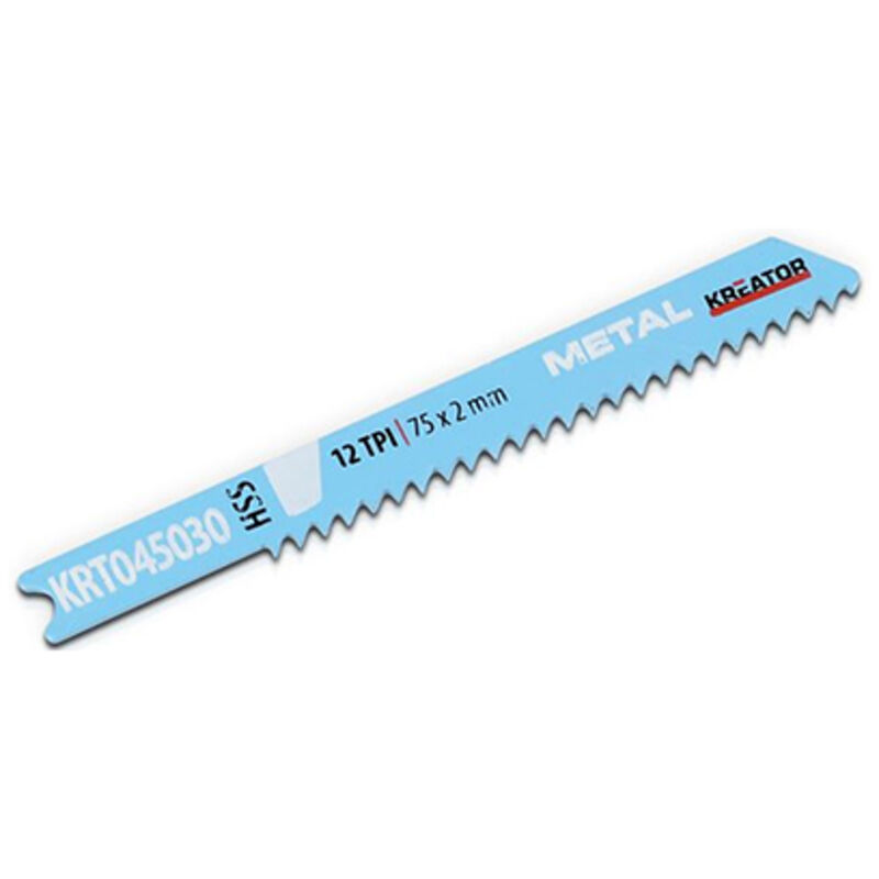 Lame - Marca Kreator - Modello KRT045030 - Per seghetto allternativo - Lunghezza 70 mm - Dentatura 12 TPI - Confezione 2 pz Lame Kreator KRT045030 confezione da 2 pezzi, lame per seghetti alternativi HSS, attacco a T, per tagli in metallo, spessore di taglio massima 6 mm. Lame in acciaio al carbonio, dentatura 12 TPI 2 mm, lunghezza totale 70 mm. Confezione da 2 lame. Per: Powerplus, Black&Decker, Bosch, Makita, Skill. ecc.