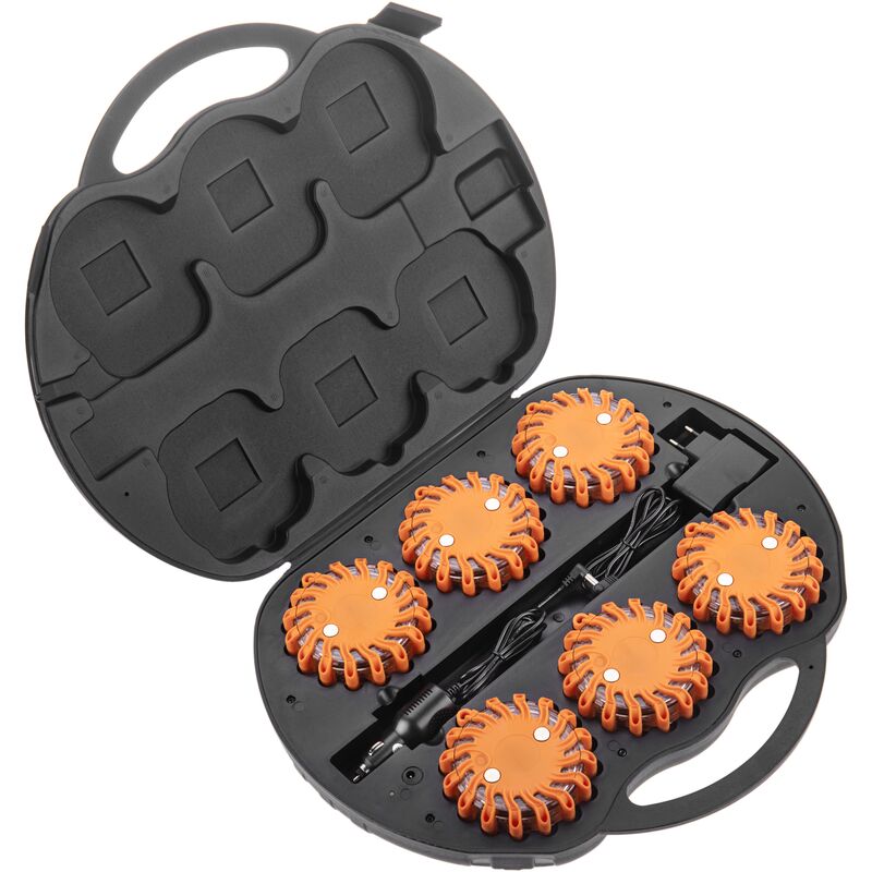 Confezione da 6 fari di segnalazione arancioni. Si tratta di un innovativo sistema di segnalazione luminosa a LED che si colloca facilmente ovunque sia necessaria l'attenzione. Ottima visibilità da tutti gli angoli di visuale. Ha una batteria interna ricaricabile che viene caricata per induzione elettromagnetica. Dispone di un pulsante ON/OFF, che permette anche di selezionare tra 9 diverse funzioni di illuminazione. Sono presentati in una comoda valigetta di trasporto che funge anche da stazione di ricarica per i lampeggianti. Ideale per tutti i tipi di segnaletica, decorazione, servizi di emergenza, segnaletica per incidenti, ecc. Specifiche Faro di segnalazione, che emette effetti di luce arancione. 9 funzioni o effetti di luce, selezionabili tramite pulsante. I fari sono composti da 16 luci LED ultra luminose con una visione a 360°. Batteria interna da 3,7V e 900mAh (modello 703048). Grado di protezione IP67. Dimensioni del faro: 106 mm (diametro) x 34 mm (altezza). Peso del faro