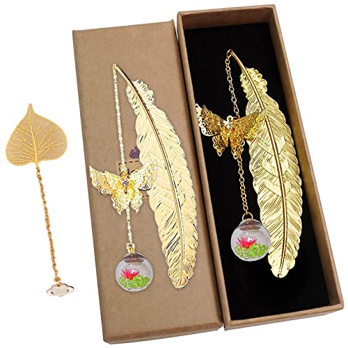 Segnalibro con Piume di Metallo, 2 Pcs Segna Libro in Piuma e 1 Segnalibro con Foglie con Elegante 3D Farfalla e Perle di Vetro Eterno FIore Secco Ciondolo con Scatola Regali per Gli Insegnanti