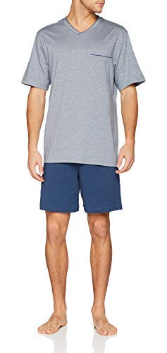 Pigiama corto da uomo di Seidensticker, parte superiore in jersey jacquard a 2 colori, doppio scollo a V con effetto piping, tasca sul petto doppia e ricamo a rose blu sull'orlo, pantaloni in jersey singolo blu marino, comodo girovita multipli in morbido jersey di qualità