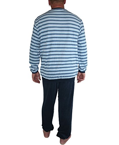 Pigiama lungo da uomo di Seidensticker con comodi polsini alle braccia e alle gambe. Parte superiore con strisce blu e bianche, scollo rotondo blu scuro con etichetta del marchio in tessuto nella zona interna del collo. Tasca sul petto con apertura e elegante ricamo a corona, pantaloni lunghi blu scuro con comodo elastico in vita in morbida spugna di alta qualità. Disponibile anche nelle taglie sottili