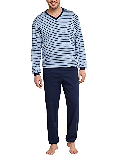 Pigiama lungo da uomo di Seidensticker con comodi polsini blu scuro su braccia, orlo e gambe. Parte superiore a costine con scollo a V sovrapposto, etichetta di marca in seta sul centro posteriore come fiocco, tasca sul petto con elegante ricamo a corona, pantaloni lunghi blu scuro con comodo elastico in vita in morbida e calda qualità Interlock. Disponibile anche nelle taglie più basse