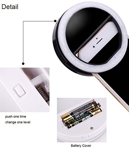 Specifiche: diametro: 2,7" / 8,6 cm Colore: nero, bianco, rosa, blu, verde: batteria integrata, ricaricabile, temperatura di colore: 3000-5000 K. Contenuto: - 36 luci LED per selfie, luminosità regolabile su 3 livelli - Batteria (integrata) 500 mAH - cavo di ricarica USB