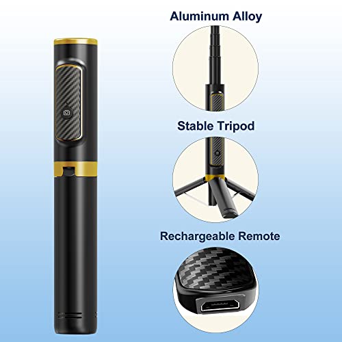 Selfie Stick - Treppiede per telefono, telecomando wireless Bluetooth, in alluminio leggero All in One, con mini treppiede con rotazione a 270°, per iPhone e telefoni Android (nero dorato)
