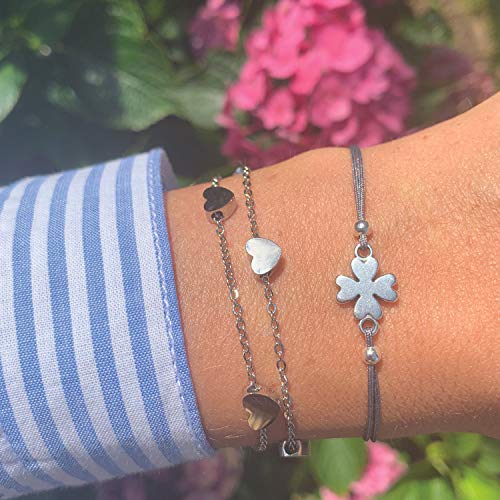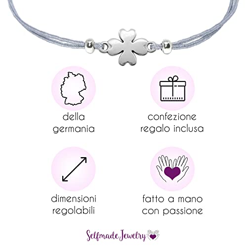 Selfmade Jewelry Bracciale a Quadrifoglio in Argento per Donna - Grigio Con Trifoglio Portafortuna In Argento - Misura Regolabile/Bracciale Portafortuna - Fatto a Mano (Argento - Grigio)
