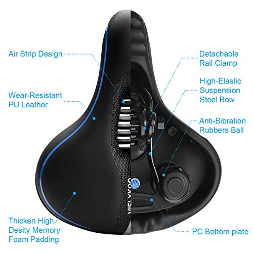 【AMMORTIZZATORE E VENTILAZIONE】 Dotato di due sfere ammortizzanti sotto il sedile della bici protegge il tuo corpo dall'acutezza tra crepe stradali, urti e gelo. Il design cavo migliora la traspirabilità, fornisce flusso d'aria e comfort nei lunghi viaggi e mantiene i glutei freschi e asciutti per lungo tempo.