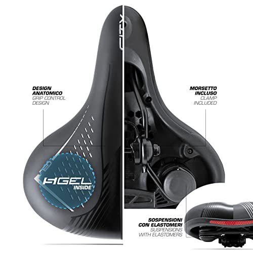 Sella per Bici Comoda con elastomeri, Sella per Bici Gel, Sella Bici Uomo Donna, Sella Bici Comoda, Sella Bicicletta con Gel, Morsetto Integrato (Nero/Grigio)