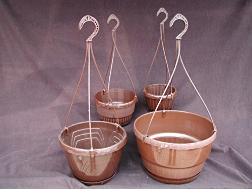 Diametro 18 cm, Marrone, in materiale plastico con sottovaso integrato e gancio resistente, stabile.