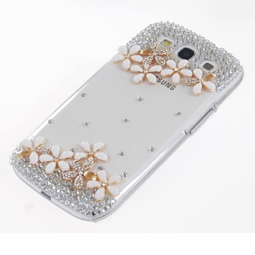 Semoss - Set di 2 accessori per Samsung Galaxy S3 iii i9300, custodia rigida trasparnete con strass e motivo floreale in rilevo, e tappo antipolvere a forma di corona con cristalli per la presa cuffie da 3,5 mm, bianco/oro