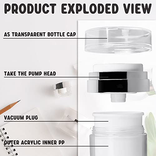 [High Quality material]: Airless Pump Jar Bottles is made of acrylic & silicone material, which is compact and lightweight, durable, leak proof and spill proof, harmless to the body and convenient to carry, they can be used for a long. Package includes: 2PCS 30ml Pump Jar Bottles.