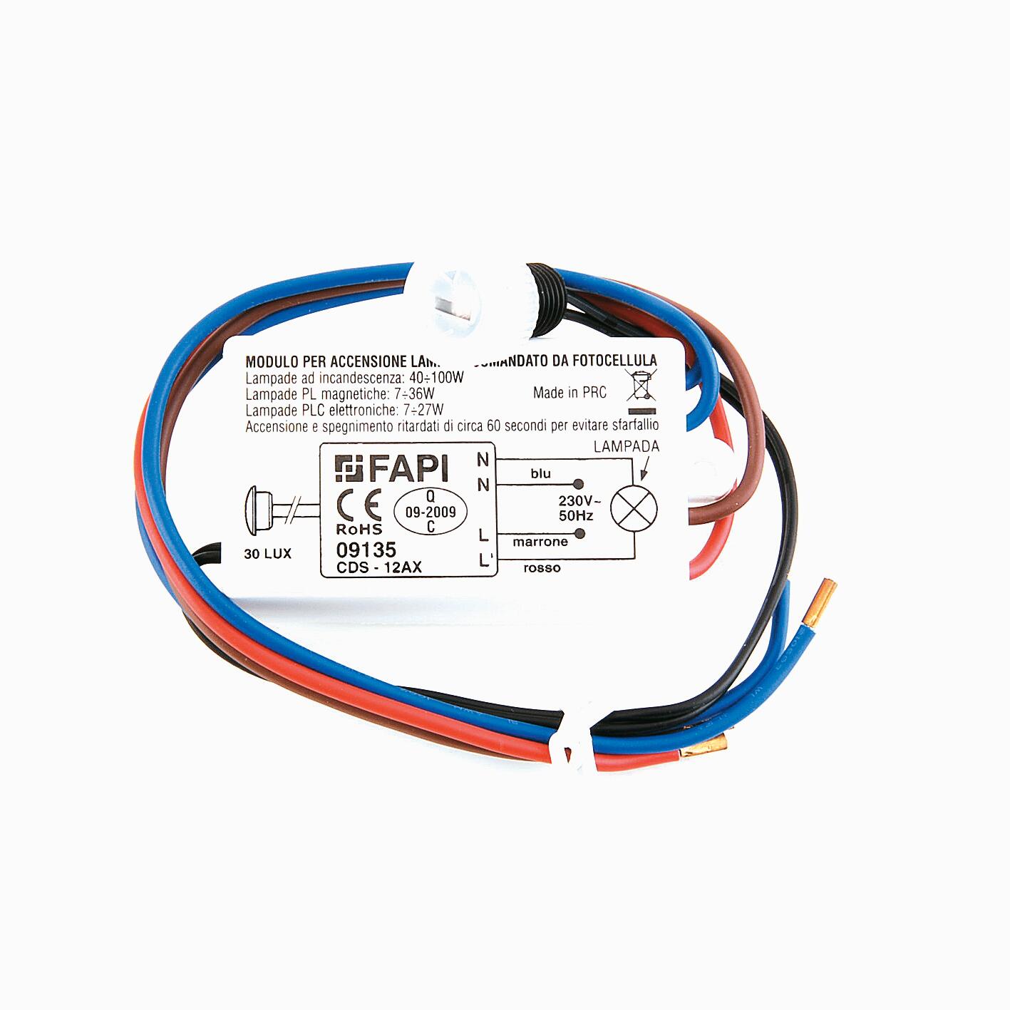 Modulo interruttore crepuscolare con da fotocellula per l'utilizzo con ogni tipo di lampada sia ad incandescenza che fluorescente.. Controllo accensione notturna di ogni tipo di lampada.. Comanda automaticamente accensione e spegnimento di luci esterne, luci da strada, luci da giardino ecc. solo se buio dal tramonto all'alba.. Potenza max 100 Watt per lampade ad incandescenza, 27 Watt per lampade fluorescenti o a scarica.. Automatico, crepuscolare.