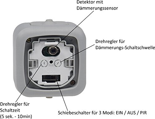 Sensore di movimento a infrarossi, portata massima 6 m, angolo di rilevamento 120°, tempo di commutazione da 5 secondi a 10 min, commutabile in modalità on/off