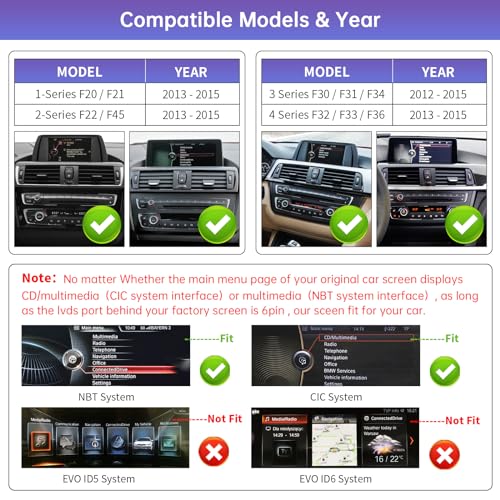 ✅ 【Modelli compatibili & Anno】:Adatto per BMW 1 2 3 4 Serie F20 F21 F22 F23 F30 F31 F32 F33 2011-2015 Anno. Non importa se la pagina principale del menu dello schermo originale dell'automobile visualizza CD/multimedia (interfaccia di sistema CIC) o multimedia (interfaccia di sistema NBT), finché la porta lvds dietro lo schermo è 6pin, il nostro articolo si adatta per la vostra auto. Ma non adatto per EVO System!!!