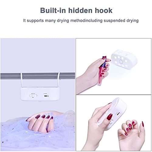 Dimensioni portatili: la dimensione dell'asciugatrice è di circa 11,2 x 5,8 cm, e il peso è di soli 117 g. Il design a gancio nascosto, può essere appeso/tenuto in mano/posizionato, una varietà di metodi di asciugatura, si può tranquillamente fare la propria manicure durante la lettura o il lavoro.
