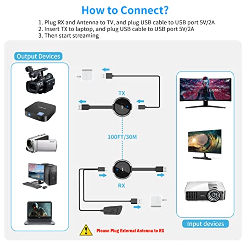 Plug & Easy to Pair: utilizzo in 2 semplici passaggi: Plug - > Premere il pulsante di TX quando viene visualizzato "Ready to Pair" - > Specchio (ogni coppia di trasmettitore e ricevitore AIMIBO viene accoppiato prima della vendita. )È facile da trasportare all'aperto in formato mini. È comodo da usare, poiché il trasmettitore può essere alimentato direttamente da alcuni laptop.