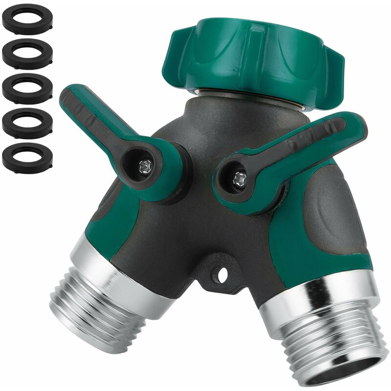 Assemblaggi di bulloni: L'ultima versione dei nostri connettori doppi per tubi dell'acqua ha ingressi e uscite rafforzati. Dopo mesi di test di laboratorio, i nostri esperti ingegneri hanno ricostruito completamente i componenti chiave dello shunt. I 2 beccucci sono ora fissati con bulloni di metallo e non si rompono. Il collo è filettato per fissare le due parti. Installazione perfetta e funzionamento regolare: Il deviatore per tubo da giardino a 2 vie ha una maniglia lunga (4 cm) per un'apertura e una chiusura agevoli e facili. Poiché il separatore è gommato, è perfetto per mani rigide o artritiche. A parte una conoscenza di base di come funzionano i rubinetti e i tubi flessibili, non sono necessari strumenti, garantendo un'installazione semplice e impeccabile. Il separatore del tubo ruota anche di 360 gradi, consentendoti di tirare e tirare il tubo in tutte le direzioni. Nessuna perdita e nessun spartiacque: I fili lunghi e lisci con anelli di gomma sull'estremità femmina rendono