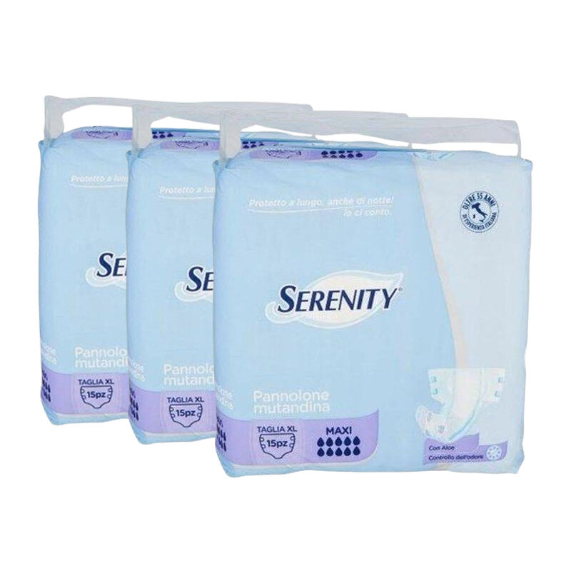 Pannolone Mutandina assorbente per incontinenza urinaria grave o molto grave e/o fecale. Con il suo tampone maxi assorbente ha elevate prestazioni di assorbimento e pelle asciutta anche durante la notte. Protezione completa unita ad un elevato comfort anche per le pelli più sensibili. grazie alla dermoprotezione con Aloe sulla superficie a contatto con la cute. Indicato per te che cerchi una maggiore assorbenza e una protezione elevata sia di giorno che di notte. Set 3 confezioni di Serenity Pannolone mutandine Maxi Con Aloe dermoprotettiva Controllo dell'odore Veste comfort Libertà di movimento Asciutto a lungo Dispositivo monouso. non riutilizzare per evitare il rischio di infezioni Sostituire il prodotto alla scomparsa dell'indicatore di umidità