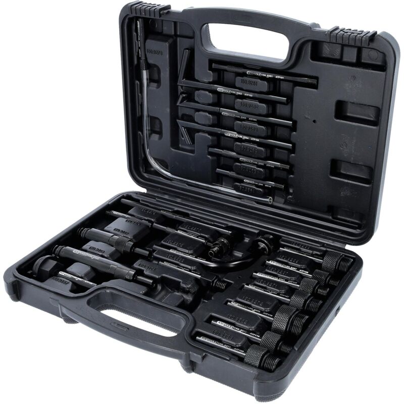 Ideale per il riempimento con olio di trasmissioni, di distributori e differenziali di diversi produttori di veicoli Grande copertura di molti marchi di veicoli, soprattutto tramite adattatore universale Non è possibile riempire di olio molte trasmissioni se non si ha questo strumento Ottimale per spazi ristretti o punti di difficile accesso Con diverse uscite angolate per un riempimento professionale ed economico Per posizioni di difficile accesso Facile utilizzo ed alto risparmio di tempo In robusta valigetta di plastica Pezzi in set 23 Peso del tessuto 1560 Dimensioni dell'imballaggio 1