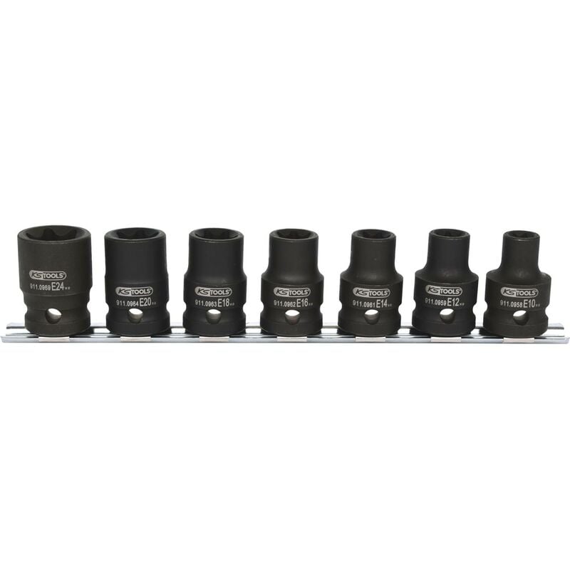 Torx profilo E Quadro femmina a norma DIN 3121 / ISO 1174 Utilizzo con avvitatori Fosfatata Cromo-molibdeno Fornite con supporto Azionamento quadro in pollici 1/2 Standard ISO 1174, DIN 3121 Profilo 1 E-TORX® Pezzi in set 7 Peso del tessuto 1450 Dimensioni dell'imballaggio 1 Materiale1 Feinster Chrom Molybdän Stahl