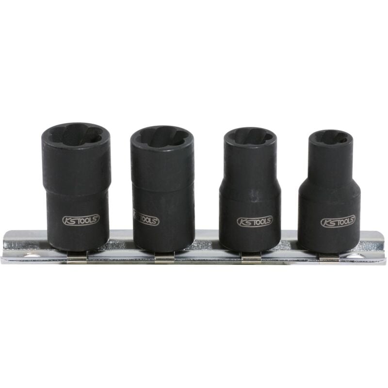 Attacco quadro femmina a norma DIN 3120 / ISO 1174 con sede per sfera di tenuta Profilo speciale rastremato con design conico-elicoidale Per estrarre viti con teste arrotondate Presa sicura tra bussola e testa della vite Fosfatata Cromo-molibdeno Fornite con supporto Azionamento quadro in pollici 3/8 Standard DIN 3120, ISO 1174 Profilo 1 Twist Socket Pezzi in set 4 Peso del tessuto 200 Imballaggio Clipleiste aus Metall Materiale2 phosphatiert Dimensioni dell'imballaggio 1 Materiale1 Feinster Chrom Molybdän Stahl