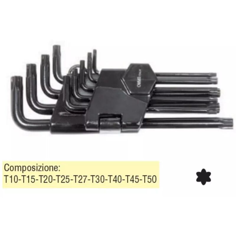Serie di Nove chiavi OMMA piegate per viti Torx, in acciaio al cromo vanadio - brunite La confezione comprende le seguenti misure: TX10 - TX15 - TX20 - TX25 - TX27 - TX30 - TX40 - TX45 - TX50