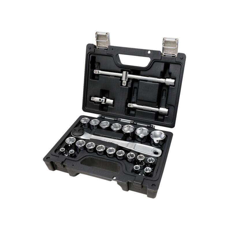 Serie di Chiavi a Bussola Beta Art. 923E/C25 SPECIFICHE: Art. 923 EC 25 cassetta in lamiera. Attacco ? composto da: - 20 bussole esagonali 8 Bussole Esagonali 920A da: 8,9,10,11,12,13,14,15,16,17,18 19,20,21,22,23,24,27,30,32 Bussole esagonali Beta 920 a Chiave a cricchetto reversibile 920E-55 da 1/4 125 mm Chiave a cricchetto Beta 920E-55 Snodo da 1/4 920/25 Snodo beta 920-25 Prolunga 920/21 da 125 mm Prolunga Beta 920-21 Prolunga 920/22 da 250 mm Prolunga Beta 920-22 Adattatore da 3/8 a 1/2 Attacco quadro Adattatore Beta c910/16F Dimensioni Valigetta: 29,5 x 8,5 x 23,5 cm