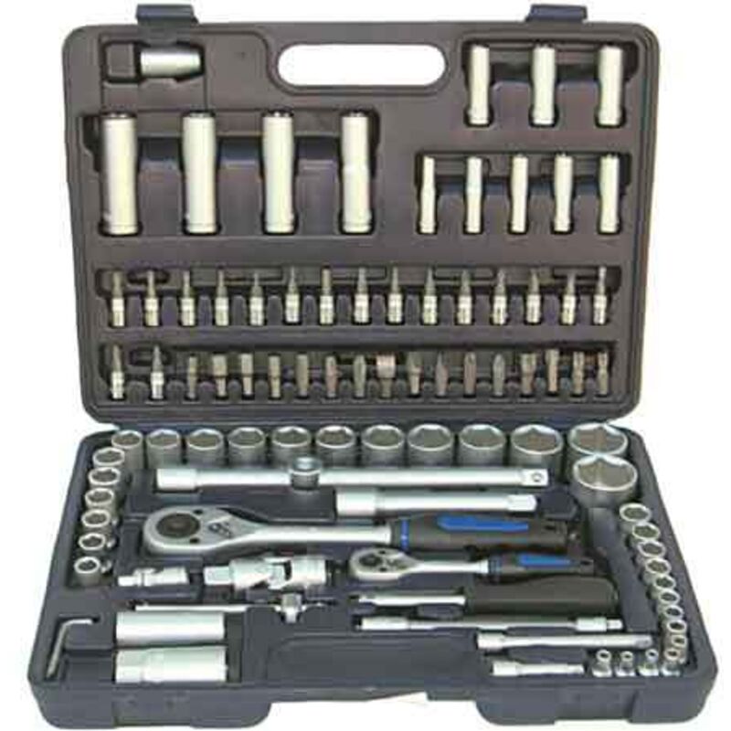 In acciaio speciale, in valigetta di plastica. Contenuto: cricchetto reversibile 1/4 e 1/2, leva a T 1/4 e 1/2, 13 bussole 1/4 (mm.4ö14), 8 bussole lunghe 1/4 (mm.6ö13), 18 bussole 1/2 (mm.10ö32), 4 bussole lunghe 1/2 (mm.14ö19), bussole per candele mm.16 e 21, 3 inserti a taglio da 1/4, 2 inserti a croce Phillips da 1/4, 2 inserti a croce Pozidriv da 1/4, 4 inserti a brugola da 1/4, 7 inserti Torx da 1/4, 2 snodi 1/4 e 1/2, 2 prolunghe 1/4 mm.50 e 100, 2 prolunghe 1/2 mm.125 e 250, prolunga flessibile 1/4, riduzione da F 1/2 a F 5/16, 15 inserti 5/16, adattatore da quadro M 1/4 a esagono M 1/4, 3 chiavi esagonali. Serie chiavi a bussola in valigetta 108 pezzi - 1/4-1/2 Utensileria manuale