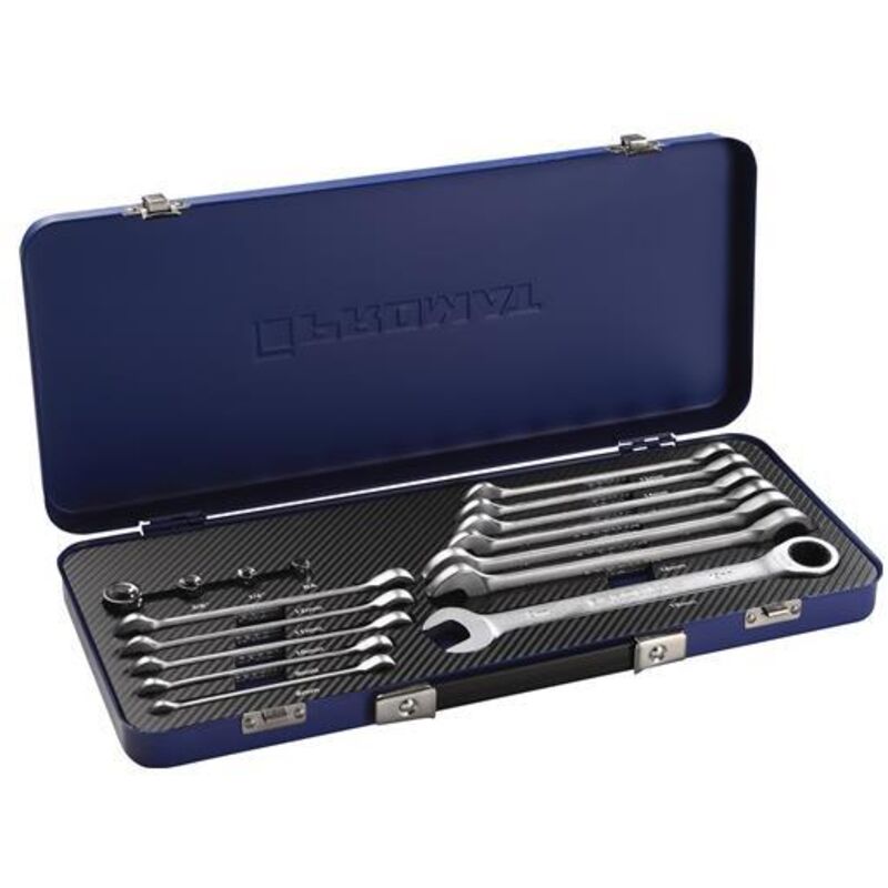Forma dritta · in acciaio CV · cromato · Bocca angolata di 15° · 72 denti Contenuto: 1 chiave ad anello scricchiolante taglia 8 / 9 / 10 / 11 / 12 / 13 / 14 / 15 / 16 / 17 / 18 / 19 mm ciascuno 1 adattatore per inserti chiave plug-in 6,3 mm (1/4) x 10 mm 10,0 mm (3/8) x 13 mm 12,5 mm (1/2) x 19 mm 1 adattatore per punte 6,3 mm (1/4) x 10 mm Altre caratteristiche tecniche: · Denti: 72 · Imballaggio: cassetta in lamiera di acciaio · Materiale: Acciaio al cromo-vanadio · Larghezze chiave: 8-19mm