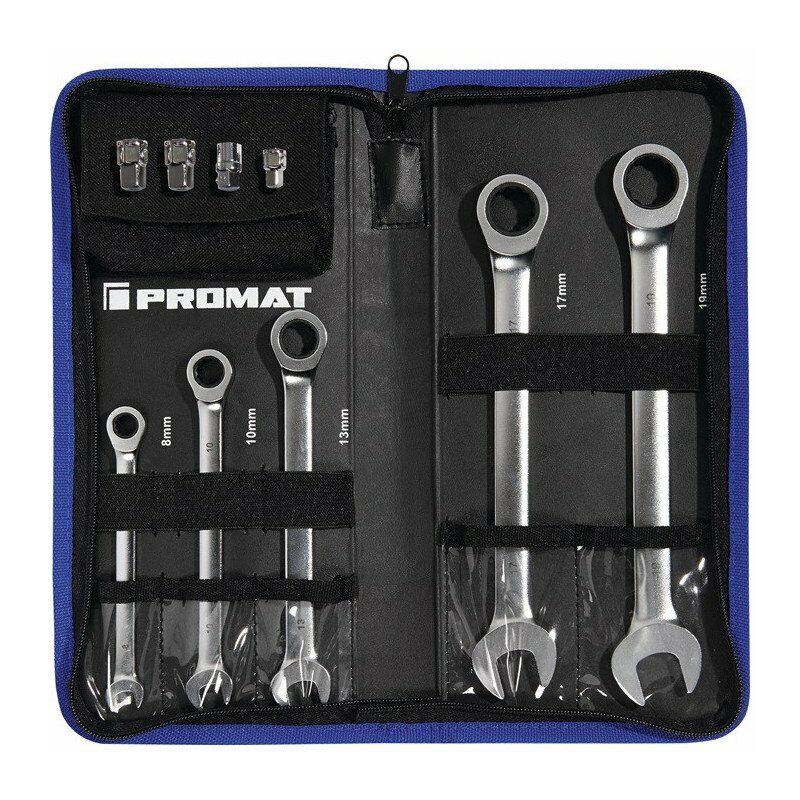 Forma dritta · in acciaio CV · cromato · Bocca angolata di 15° · 72 denti · Contenuto: 1 chiave ad anello scricchiolante ogni 8 / 10 / 13 / 17 / 19 mm ciascuno 1 adattatore per inserti chiave plug-in 6,3 mm (1/4) x 10 mm, Adattatore da 12,5 mm (1/2) x 19 mm 1 per punte 6,3 mm (1/4) x 10 mm adattatore aggiuntivo da 1 10 mm (3/8) x 13 mm Altre caratteristiche tecniche: · Denti: 72 · Confezione: in sacchetto pieghevole · Materiale: Acciaio al cromo-vanadio · Larghezze chiave: 8-19mm