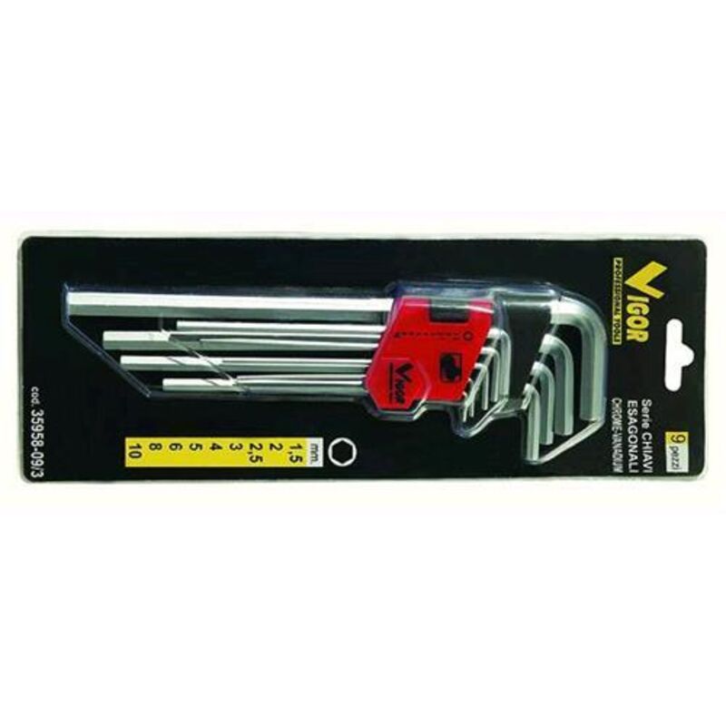 Serie di 9 chiavi maschio esagonali, o brugole, piegate, realizzate in acciaio cromo vanadio, delle dimensioni di mm 1,5-2-2,5-3-4-5-6-8-10, perché sia più facile e meno faticoso avvitare nel settore del fai-da-te. Fornite su supporto/display in plastica. Marchio Vigor
