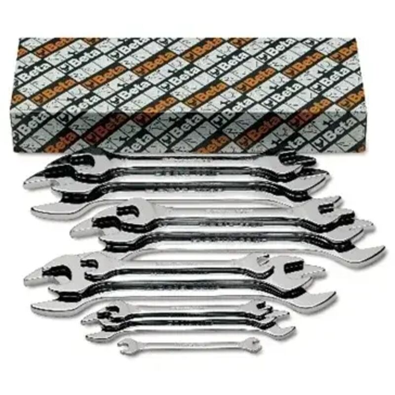 Serie di 8 chiavi a forchetta doppie (art. 55MP) Finitura cromata lucida. Misure: 6x7 - 8x9 - 10x11 - 12x13 - 14x15 - 16x17 - 18x19 - 20x22 - 21x23 - 24x26 - 25x28 - 27x29 - 30x32 mm