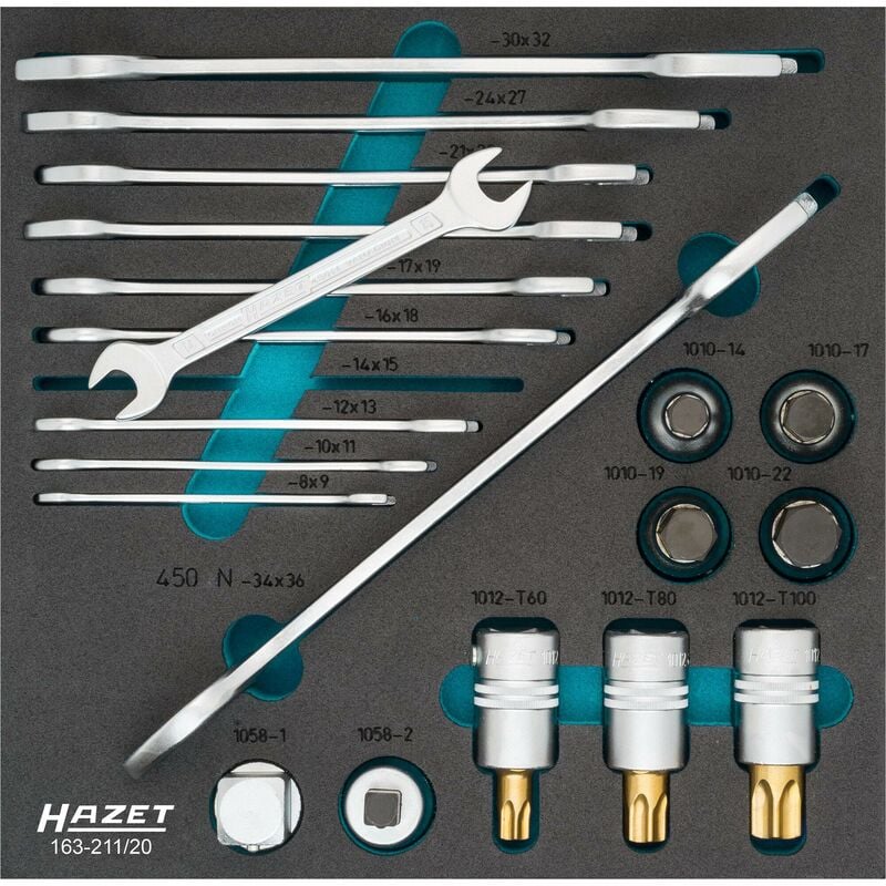 Safety-Insert-System HAZET (SIS) Made in Germany Attacco: Attacco quadro, cavo, 3/4 di pollice (20 mm) Presa di forza: Profilo esagonale esterno, Profilo esagonale interno, Profilo interno TORX® Dimensioni / Lunghezza: 344 mm x 342 mm Per utilizzo manuale Dimensione sistema di ordinamento: 2/3 (344 x 342 mm) Safety-Insert-System HAZET (SIS) Sistema di ordinamento perfetto - tutti gli utensili saldamente inseriti al loro posto Rapido controllo di completezza integrato - individuazione immediata dell'utensile mancante Infinite possibilità di combinazione Numero utensili: 20 Azionamento 3/4 Zoll (20 mm) Vierkant hohl Lunghezza (cavo) 344 Unità di uscita Außen Sechskant Profil, Innen Sechskant Profil, Innen TORX® Profil Dimensioni dell'imballaggio 1 Contenuto della fornitura 450N-8X9, 450N-10X11, 450N-12X13, 450N-14X15, 450N-16X18, 450N-17X19, 450N-20X22, 450N-21X22, 450N-24X27, 450N-30X32, 450N-34X36, 1010-14, 1010-17, 1010-19, 1010-22, 1012-T60, 1012-T80, 1012-T100, 1058-1, 1058-2