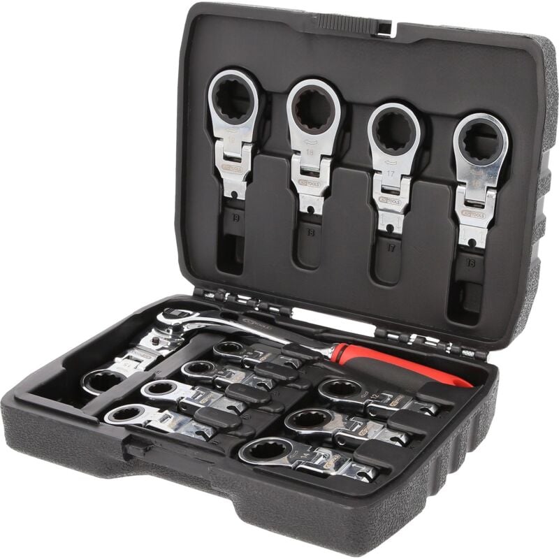 Poligonale Dentatura precisa con 72 denti Testa orientabile a 180° chiave a cricco bloccabile a 360° con inserti di chiave ad anello intercambiabili Con impugnatura ergonomica bi-componente Finemente satinate Cromo-vanadio In robusta valigetta di plastica Profilo 1 12-Kant Pezzi in set 13 Peso del tessuto 1350 Imballaggio Kunststoffkoffer Dimensioni dell'imballaggio 1 Forma 180° schwenkbarer Kopf Materiale1 Feinster Chrom Vanadium Stahl, matt satiniert verchromt
