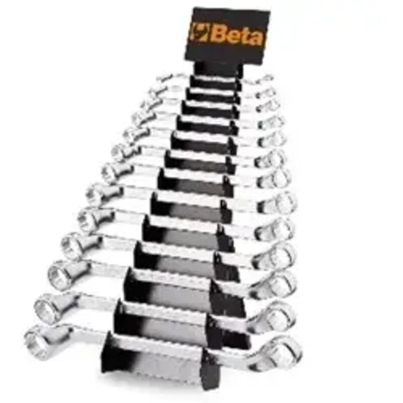 Serie di 13 chiavi poligonali Beta doppie curve (art. 90) con supporto in lamiera da banco Misura: 6x7 - 8x9 - 10x11 - 12x13 - 14x15 - 16x17 - 18x19 - 20x22 - 21x23 - 24x26 - 25x28 - 27x29 - 30x32 mm Peso: 4,2 Kg