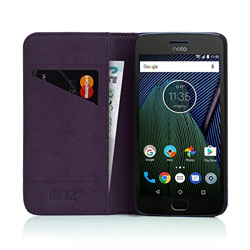 32nd Serie Classica - Custodia a Portafoglio in Pelle Vera per Motorola Moto G5, Case Realizzato in Pelle Premium con Diversi Comparti, Chiusura Magnetica e Supporto integrato - Melanzana