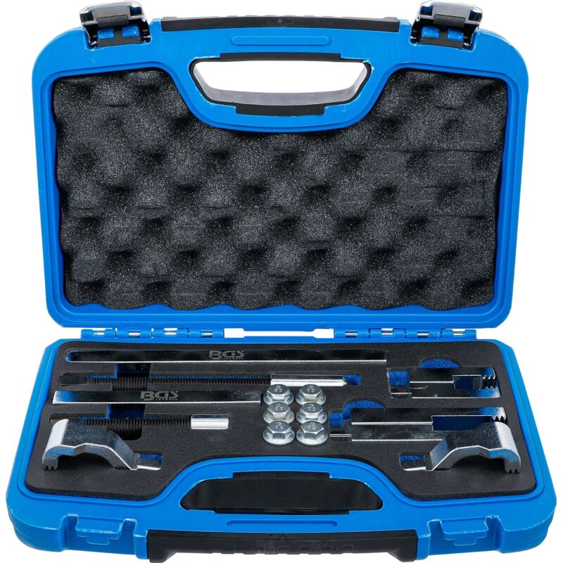 Per sfilare e infilare pulegge su pompe di servosterzi, ruote della ventola, alternatori 2 traverse: 140 mm, 230 mm 2 paia di piedini: Lunghezza 60 mm, 110 mm 1 paio di piedini in forma speciale: lunghezza 60 mm I piedi e le traverse sono combinabili tra di loro Adatto per pulegge di mass. Ø 200 mm Peso del tessuto 4.3 Dimensioni dell'imballaggio 1 Peso lordo 4300 g