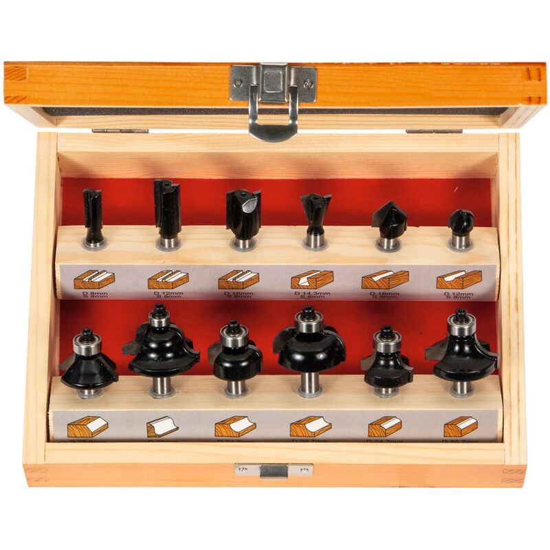 2 taglienti, a taglio frontale e per contornare, codolo di 8 mm. Uso: Per fresare scanalature e profili su legno duro, pannelli rivestiti, plastica, ecc. Fornitura: * 1 fresa per smussi 45° * 2 frese a quartuccio r6 + r9 * 3 sbavatori cavi per scanalature r6 + r6,35 + r9,5 * 1 fresa per gole * 3 frese per scanalature 8 + 12 + 16 mm * 1 fresa per sbavare 14,3 mm * 1 fresa per la lavorazione di cave 11 mm/60° * in astuccio di legno Dati tecnici Imballaggio Astuccio in legno ⌀ Gambo mm 8 Materiale da taglio HM Tipo di prodotto Fresa per profili Numero di frese per cave 1 Numero di frese per smussi 1 Numero di frese concave per quarti di tondo 2 Numero di frese 12 Numero di sbavatori cavi per scanalature 3 Numero di frese coniche a livello 1 Numero di frese per scanalat. 2 Numero di frese per scanalature 1 Numero di frese barretta per cornici 1