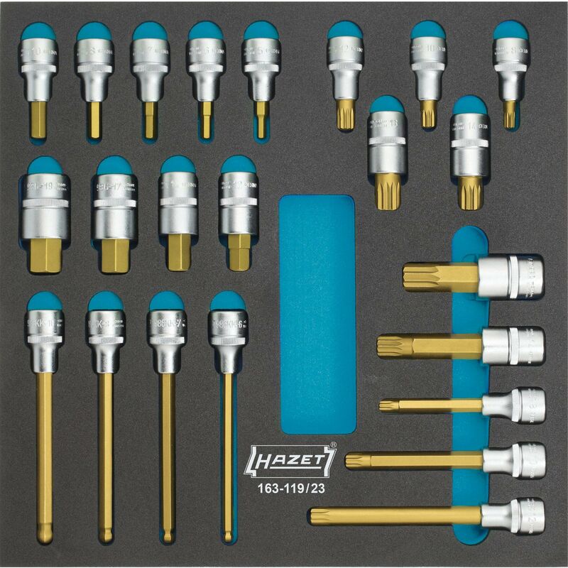 Safety-Insert-System HAZET (SIS) Safety-Insert-System, alloggiamento in espanso morbido bicomponente. Alloggiamento adatto anche per HAZET Assistent Superficie: con rivestimento in TIN Made in Germany Attacco: Attacco quadro, cavo, 1/2 di pollice (12,5 mm) Presa di forza: Profilo esagonale interno, Profilo poligonale interno XZN Dimensioni / Lunghezza: 344 mm x 342 mm Peso netto (kg): 2.88 kg Per utilizzo manuale Dimensione sistema di ordinamento: 2/3 (344 x 342 mm) Safety-Insert-System HAZET (SIS) Sistema di ordinamento perfetto - tutti gli utensili saldamente inseriti al loro posto Rapido controllo di completezza integrato - individuazione immediata dell'utensile mancante Infinite possibilità di combinazione Adatto a tutti i carrelli portautensili HAZET Assistente con cassetti Per i carrelli portautensili Assistente 173, 179 (XL-XXL) e 180 raccomandiamo di utilizzare anche gli alloggiamenti in espanso morbido 163-522x40 o 163-522x50 Numero utensili: 23