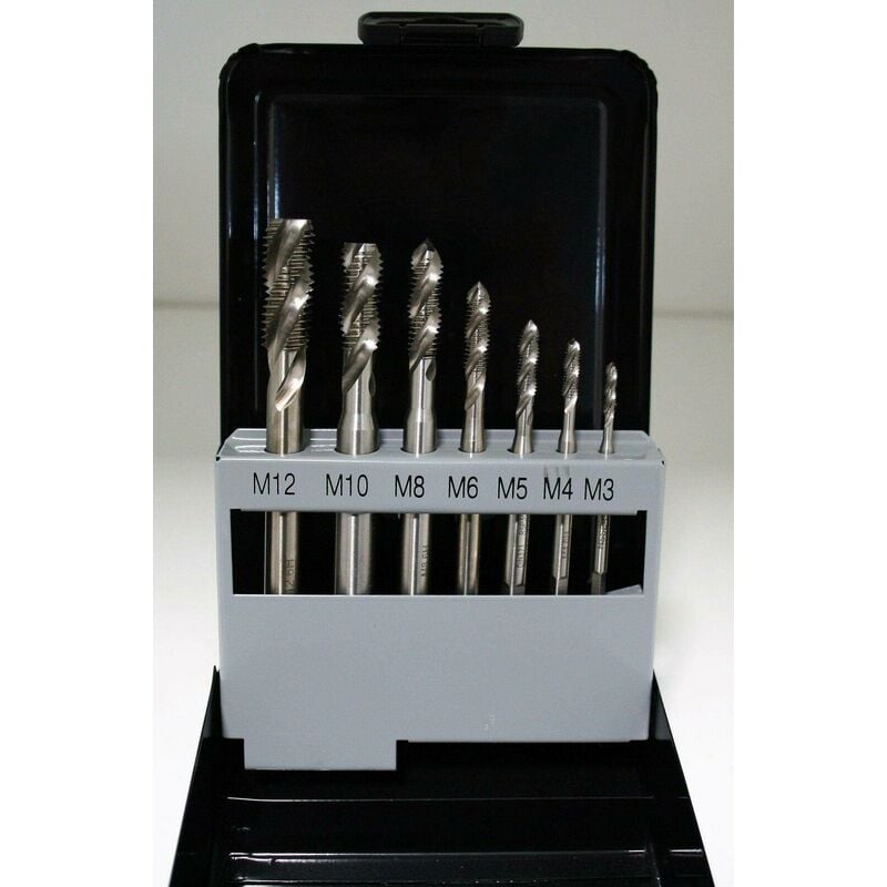 Descrizione Serie 7 maschi HSS a macchina con scanalature a 35. Composizione: 7 maschi HSS finitori a macchina. DIN 371/C - DIN 376/C M3 - M4 - M5 - M6 - M8 - M10 - M12 In cassetta di metallo verniciata.
