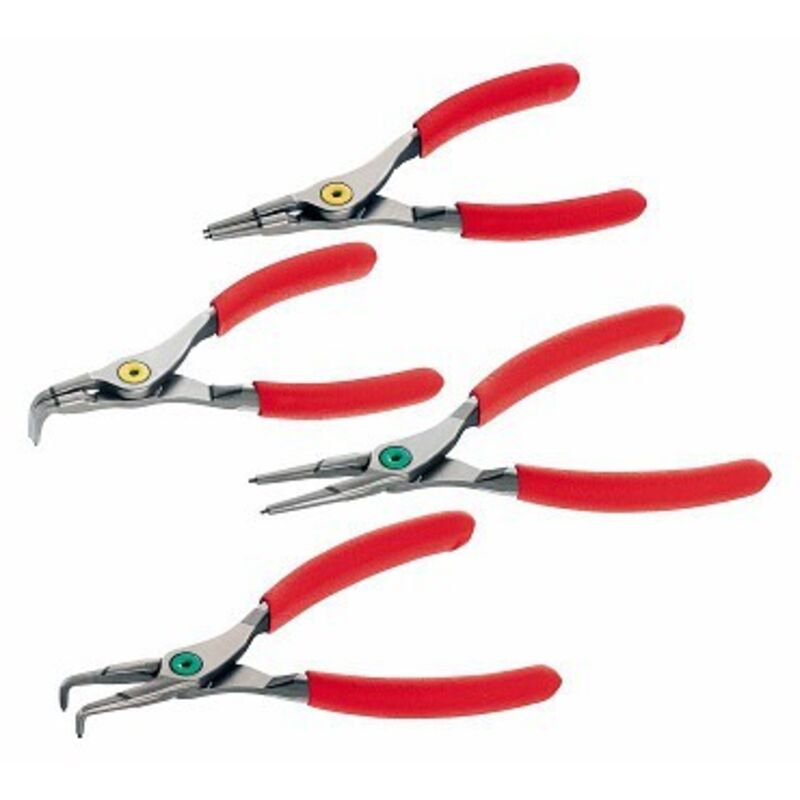 SERIE DI 4 PINZE PER ANELLI ELASTICI 127 N/SE4 - USAG • Modello di precisione • Punte in acciaio armonico inserite nei becchi: durata superiore rispetto alle punte tornite • Superficie di appoggio degli anelli tra le punte ed i becchi • Molla integrata nel corpo della pinza • Manici rivestiti in PVC antiscivolo • Esecuzione verniciata trasparente Articolo Pezzi Misure 127 N - Pinze a becchi diritti per anelli elastici interni 1 19÷60 127 PN - Pinze a becchi piegati a 90° per anelli elastici interni 1 19÷60 128 N - Pinze a becchi diritti per anelli elastici esterni 1 19÷60 128 PN - Pinze a becchi piegati a 90° per anelli elastici esterni 1 19÷60