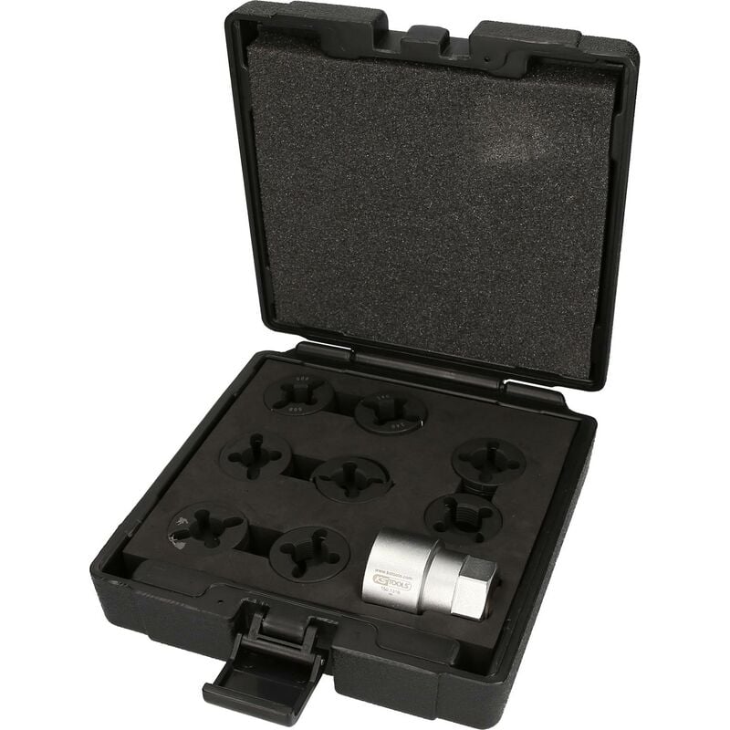 Per ravvivare e pulire le filettature esterne Assortimento ideale per dadi ruota Ideale per zone di difficile accesso Taglio destrorso Acciaio ad alte prestazioni In robusta valigetta di plastica Campi di applicazione: Veicoli commerciali - perni filettati di dimensioni: M20x1,25, M20x1,5, M22x1,0, M22,1,5, M24,1,5, M24x2, 13/16“- 20 UNEF, 3/4“-20 UNEF Pezzi in set 9 Peso del tessuto 1418 Imballaggio Kunststoffkoffer, extra robust Dimensioni dell'imballaggio 1 Materiale1 Hochleistungsstahl